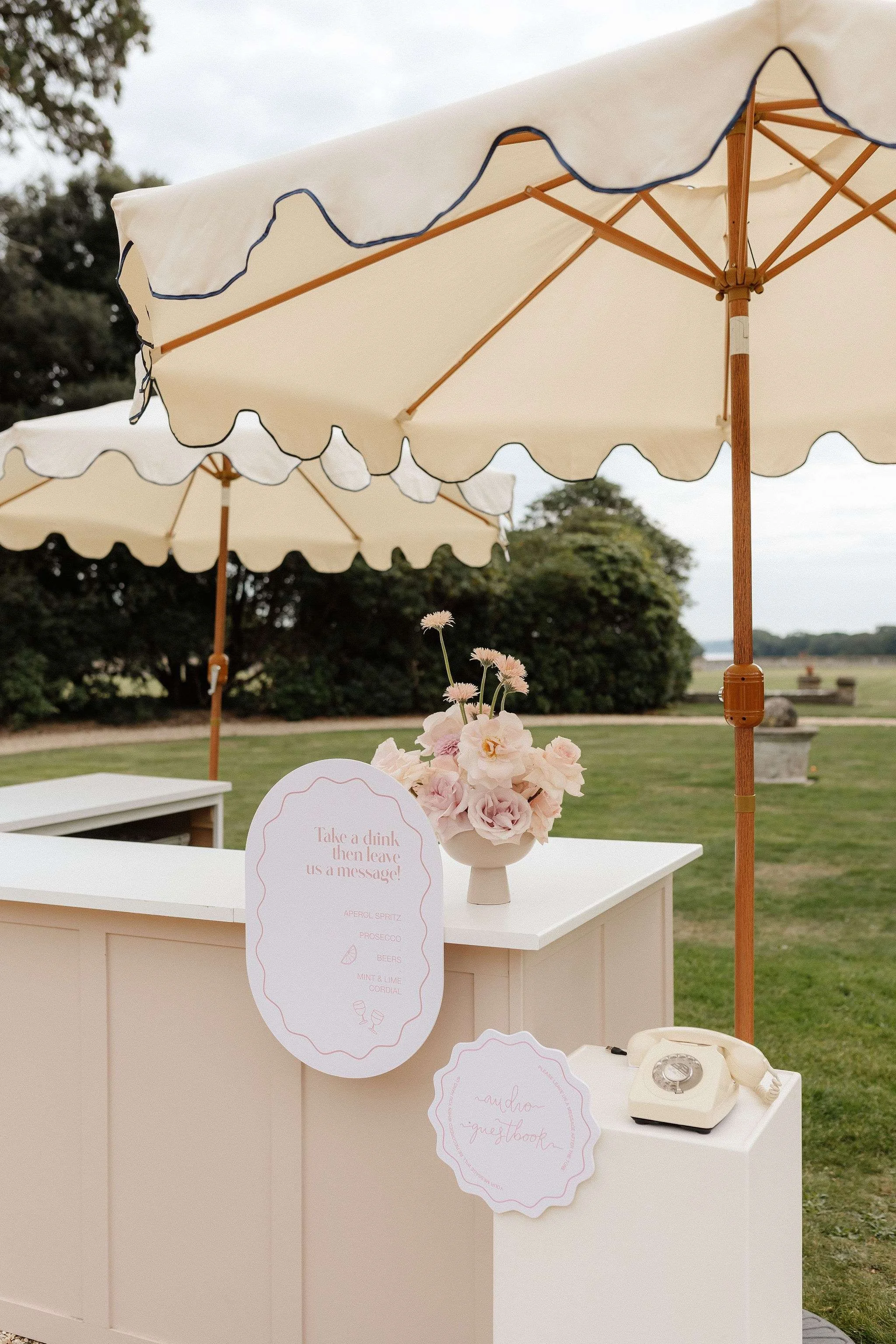 Outdoor drink station with a cream-colored counter, beige umbrellas, a floral centerpiece with pink and cream flowers, and a sign indicating different beverages and instructions for leaving a message.