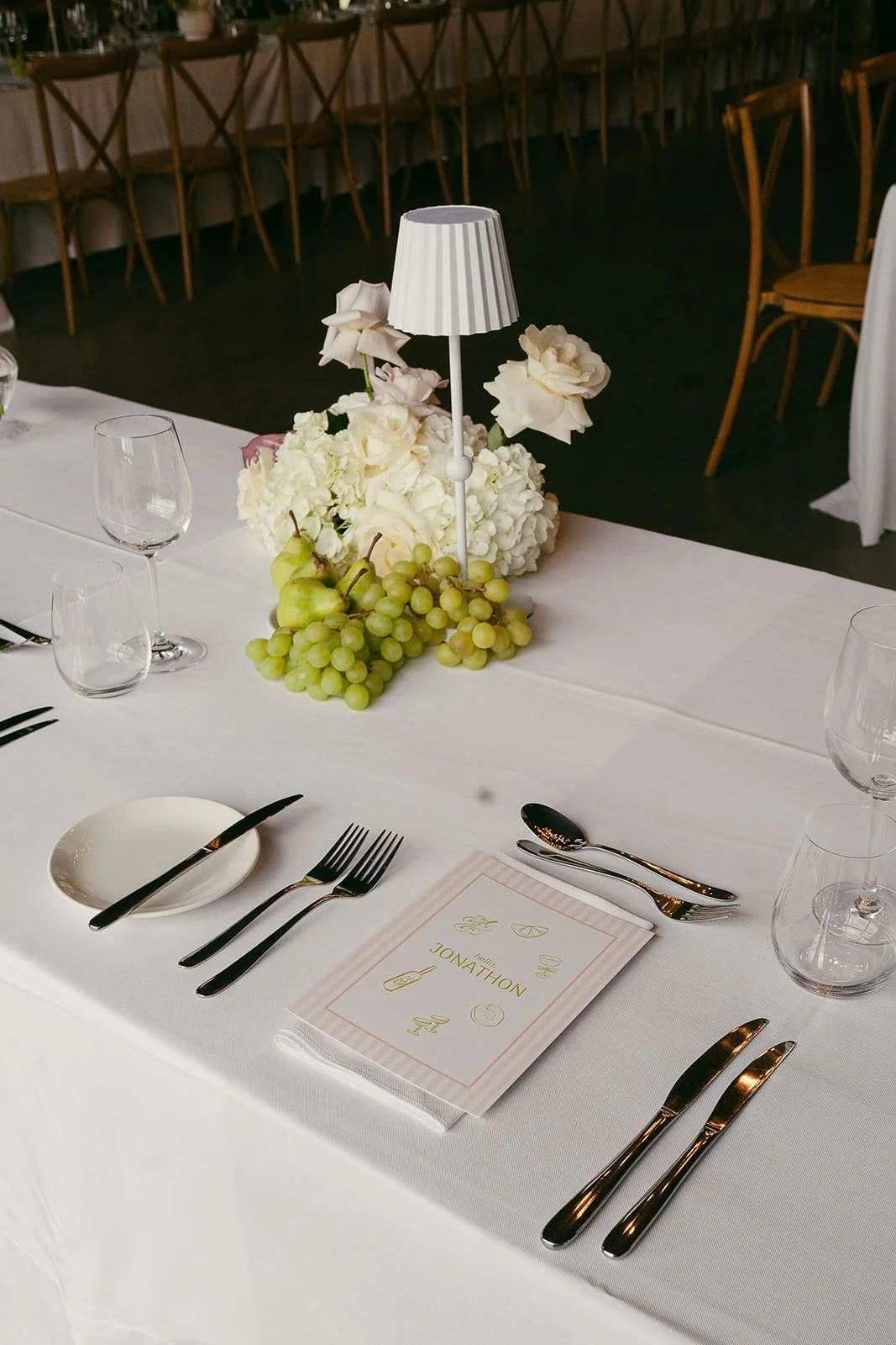Elegant dining table with white tablecloth, silverware, wine glasses, a small plate, and a white booklet with gold accents that reads 'Welcome JONATHON.' The centerpiece is a white floral arrangement with green grapes and a small white table lamp.