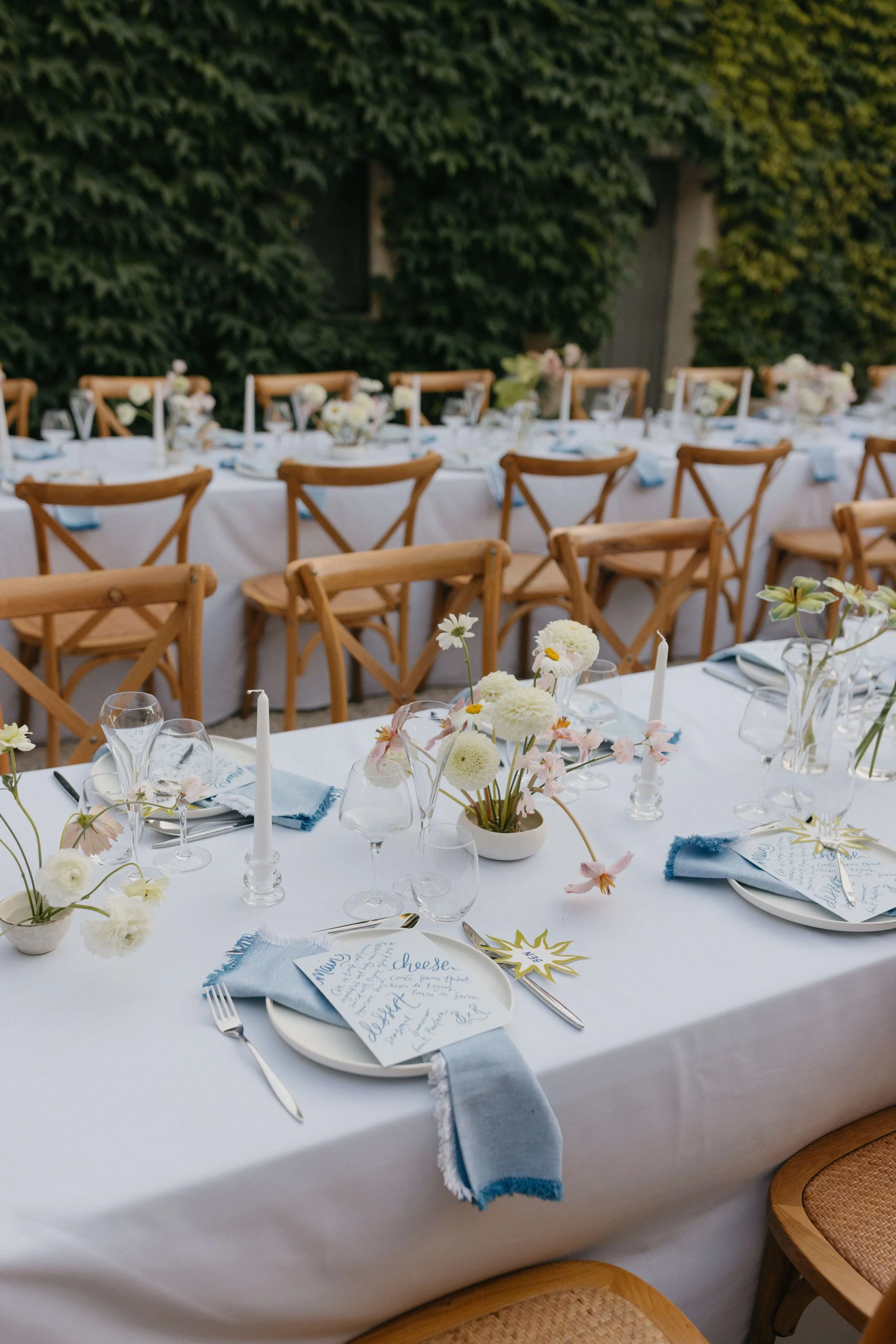 Elegant outdoor table setup with white tablecloth, floral centerpieces, candles, glassware, and place settings with handwritten menus on blue napkins, surrounded by wooden chairs, set against a lush green hedge background.