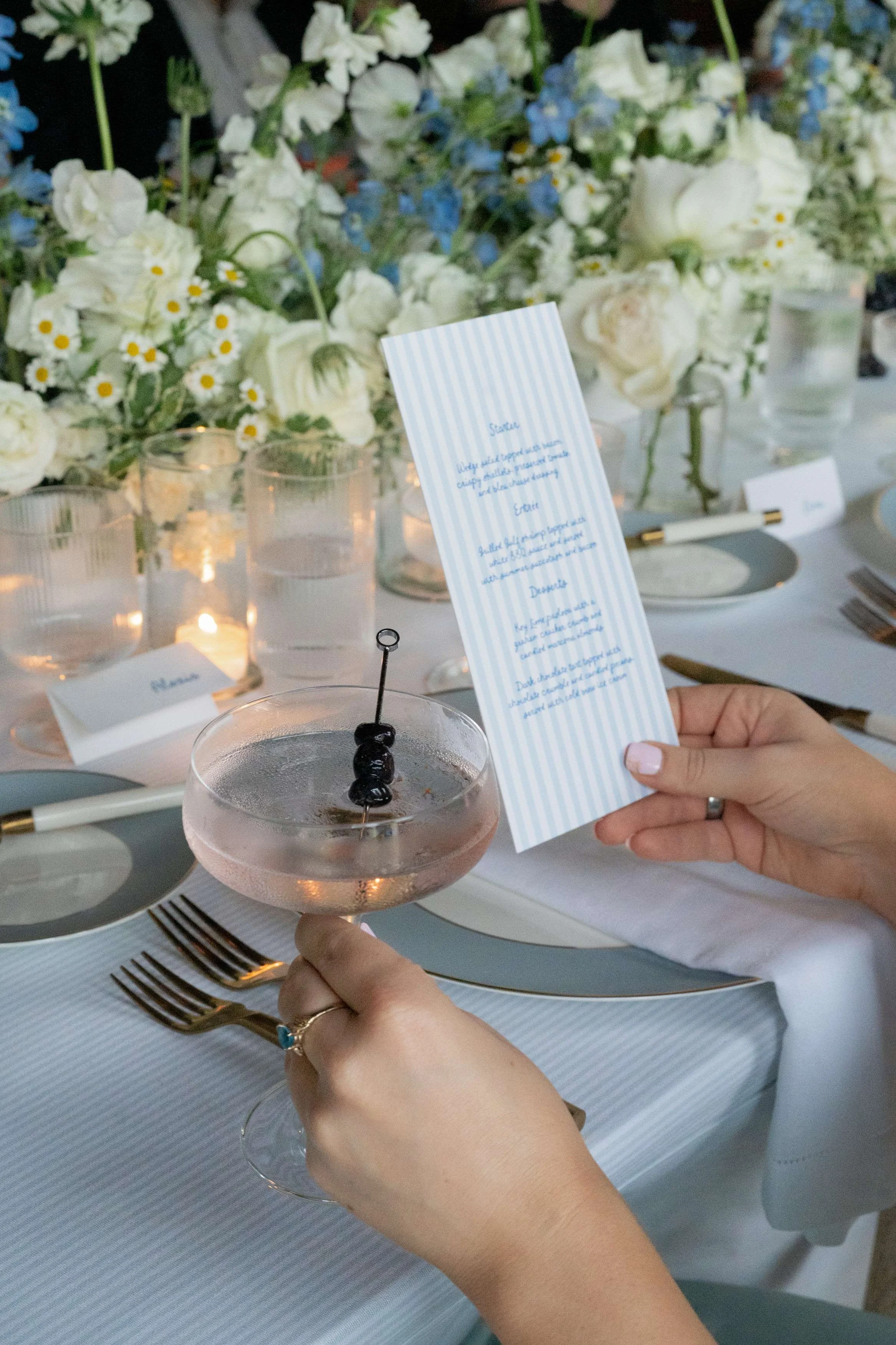 A person holding a pink cocktail garnished with blueberries and a cocktail pick, with a wedding reception table set with floral centerpieces, candles, and place cards in the background.