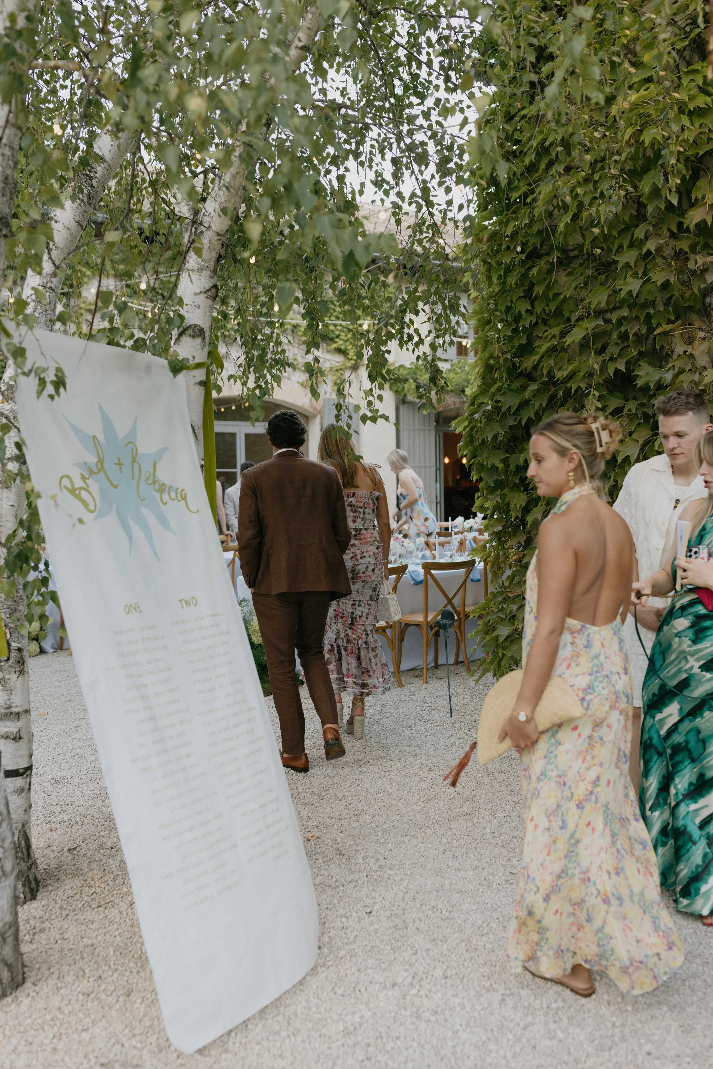 Guests walking towards a reception area at an outdoor event with a decorative sign on the left that reads 'Bride + Rebecca'. The scene features trees, greenery, and tables set up for a celebration.
